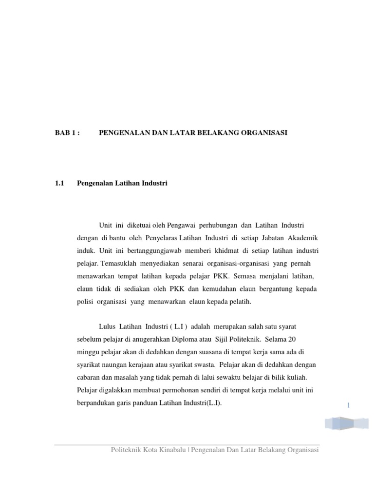1.3 kepentingan latihan industri kepada pelajar latihan industri merupakan satu cabang bidang ilmu yang mem beri peluang kepadaseseorang pelajar untuk mengaplikasikan setiap proses pembelajaran yang dilalui semasa sesididalam bilik kuliah.