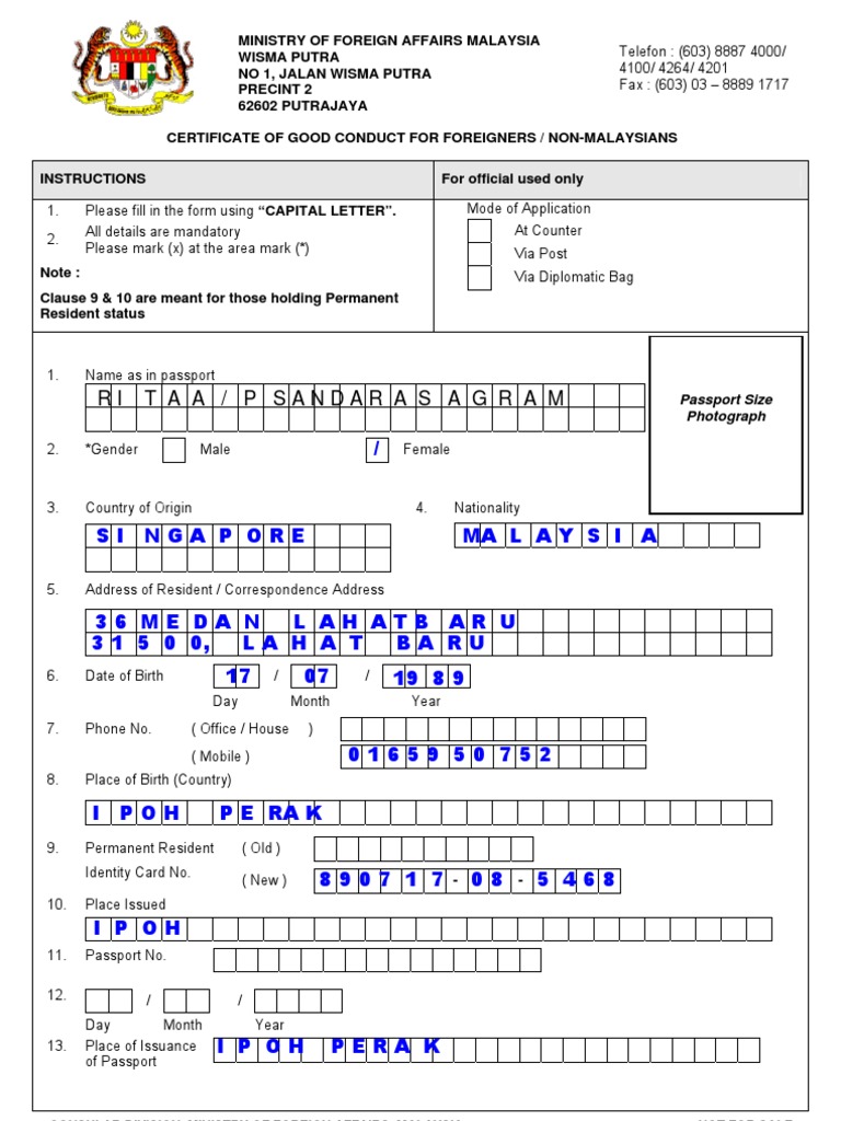 From that page, you should see c24 form that you will be required to fill in all your details. This is needed when you apply for overseas visa. 100 % approved by malaysian embassy. Basically , you want to migrate/study/work overseas. Recently, i have applied for the good conduct certificate. Would like to start immigration process for a developed country. Police certificates and ircc requirements. Australia malaysia work and holiday. This certificate of good conduct can be requested online from the website of the high commission of malaysia and by using their online portal. 23.06.2021 penyertaan yb menteri luar negeri malaysia ke persidangan secara maya peringkat tinggi asia dan pasifik mengenai kerjasama inisiatif jalur dan laluan (belt and road initiative) 23. 'certificate of good conduct' (cgc) issued by the ministry of foreign affairs, malaysia. The copyright of the image is owned by the owner, this website only displays a few snippets of several keywords that are put together in a post summary. Following link can take yo.